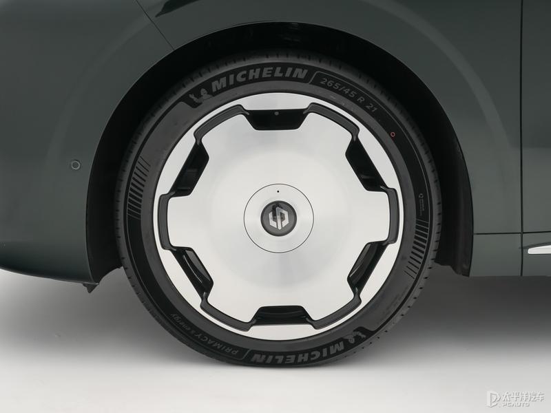 车身侧面设计简洁,搭配隐藏式车门把手.新车前后侧翼子板微宽出车体,前翼子板上镶嵌有摄像头硬件,轮拱内则搭配 21 英寸向往之境轮毂及米其林高性能静音轮胎。车身提供松谷绿、液态银、金属黑、天幕灰、光电白五种颜色选择