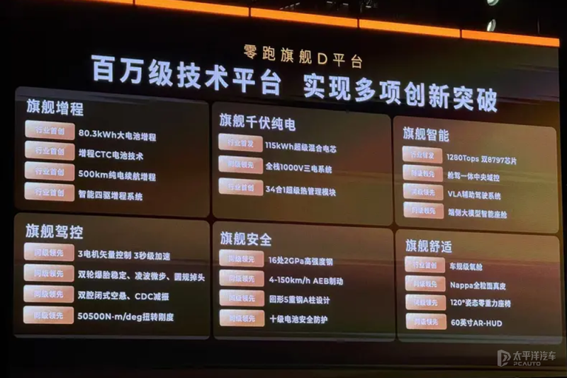 零跑D19基于零跑旗舰 D 平台打造,该平台历经十年技术沉淀,零跑在新能源整车架构、电子电气架构、电池系统、电驱系统、智能座舱系统、辅助驾驶系统等方面均实现自研。此外,新车零部件来自全球一流合作伙伴,包括宁德时代电芯、采埃孚发电机、博世孔辉双腔空悬、高通芯片、米其林轮胎等。